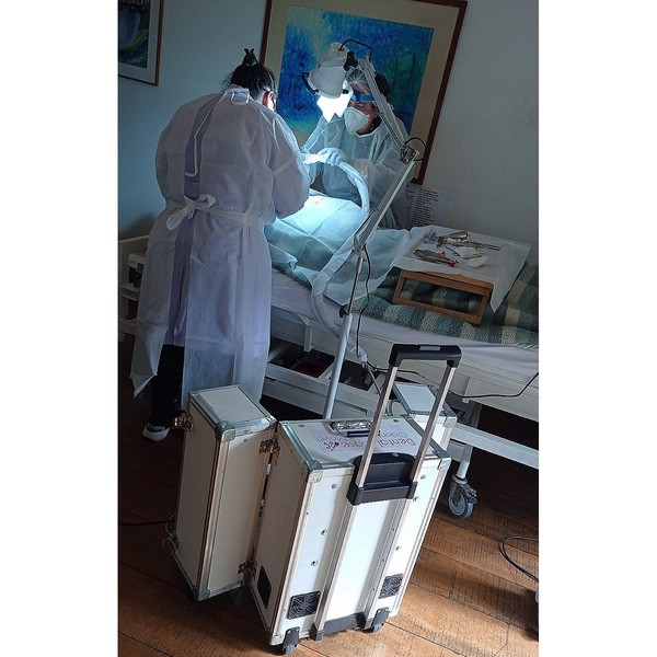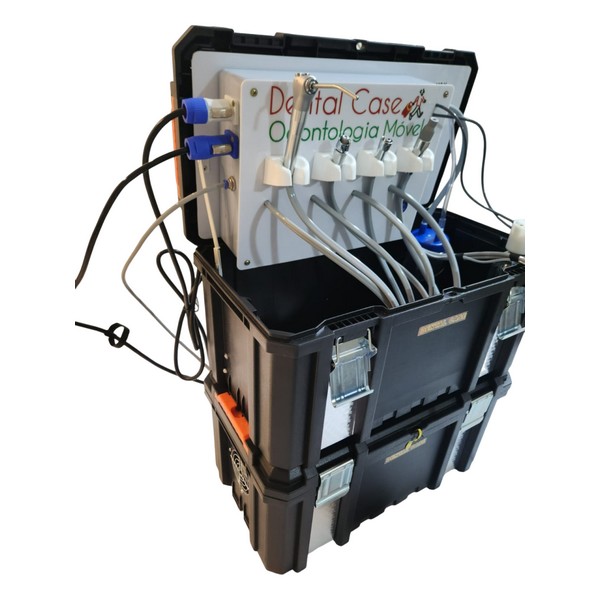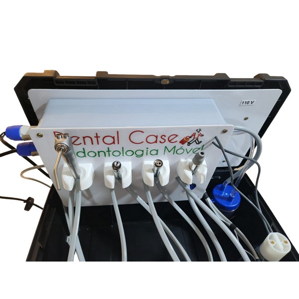 Montado dentro de uma maleta portátil, com os principais equipamentos que o dentista precisa.